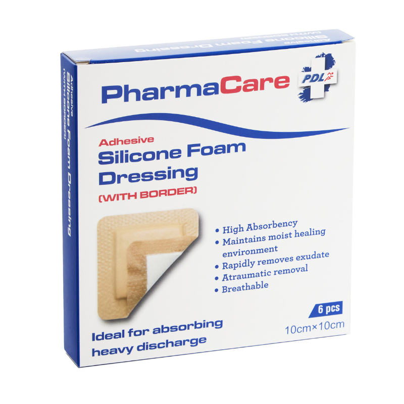 The PharmaCare Silicone Foam Dressing (with border) is ideal for absorbing heavy discharge. This dressing is highly absorbent and breathable, but maintains a moist healing environment. It rapidly removes exudate, and allows for an atraumatic removal.